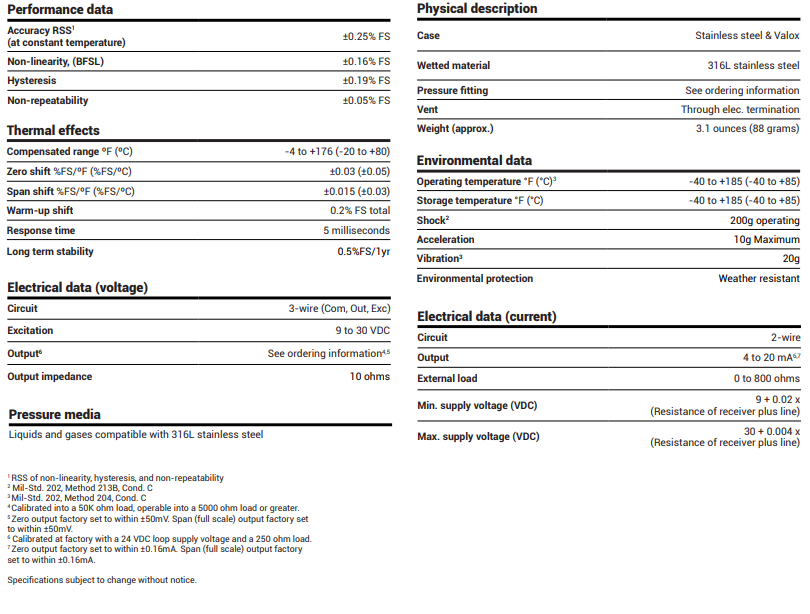 The Model 209H pressure transducer is designed for customers who require high performance, reliability and versatility in harsh applications. The Model 209H features all 316L stainless steel wetted materials, ideal for the demanding requirements of the alternative energy market. The sensor offers many pressure and electrical connections to satisfy challenging installation requirements. The 209H features a patented overpressure stop to protect the sensor against unexpected spikes or in high pulsation applications.