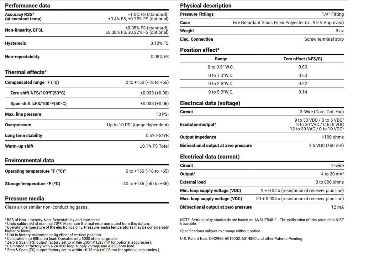 Setra’s Model 265 is a lower price solution that offers an excellent price to performance ratio and meets the requirements in all typical HVAC applications. The 265 is a low differential pressure transducer that uses a dead-ended capacitive sensing element that requires minimal amplification and delivers excellent accuracy and longterm stability. It delivers ±0.25%, ±0.4% and ±1% FS accuracy options with pressure ranges from 0.25” W.C. up to 100” W.C. The 265 has a small footprint, an AC power option and an optional conduit cover that allows for simple, secure installation for any applications.